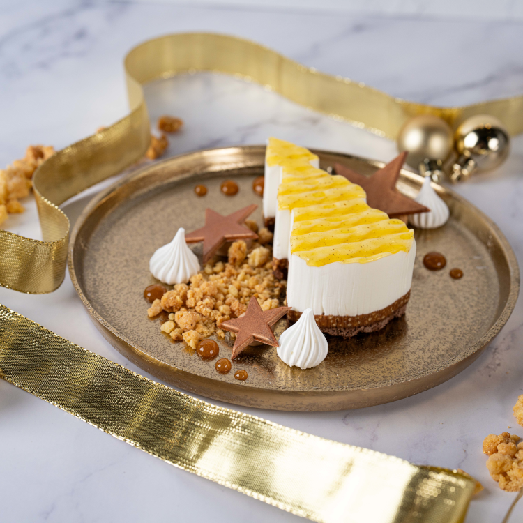 Het ultieme Kerst dessert in de vorm van een Kerstboom. Chocolade biscuit met een krokante karamel melkchocolade laag, fluweel zachte cheesecake bavarois en vanille gelei.