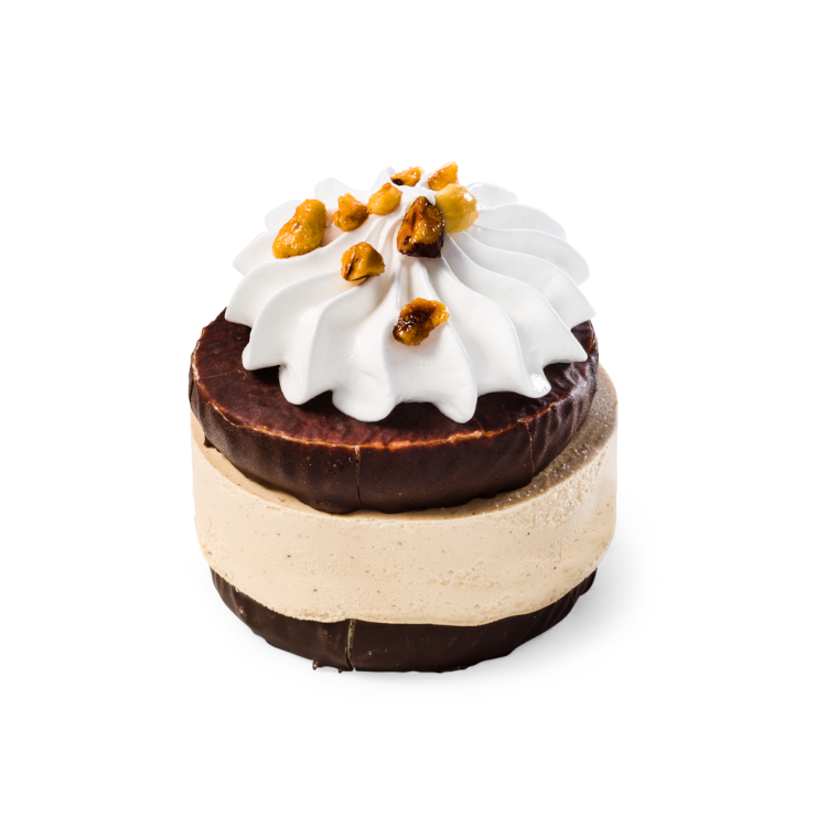Een luchtige klassieker in een nieuw jasje: hazelnoot roomijs en meringue schuim omhuld door chocolade. Ideaal als ijs dessert of als feestelijk ijstaartje!